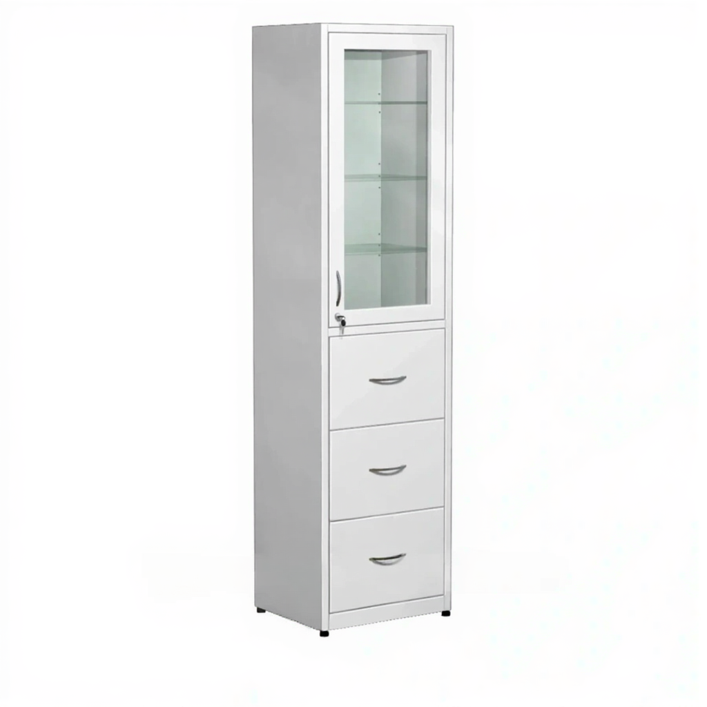 Шкаф для медикаментов стекло в металлической рамке, с ящиками ШМп-3 (белый) активно используются в больницах, лабораториях, аптеках, где необходимо хранение медикаментов, медицинского инвентаря, одежды работников, приборов, больничной документации.