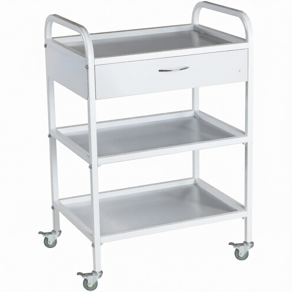 Стол медицинский инструментальный СМИ-03-01 (полки металл, колёса серая резина) предназначен для размещения инструмента, лекарственных препаратов и приборов.