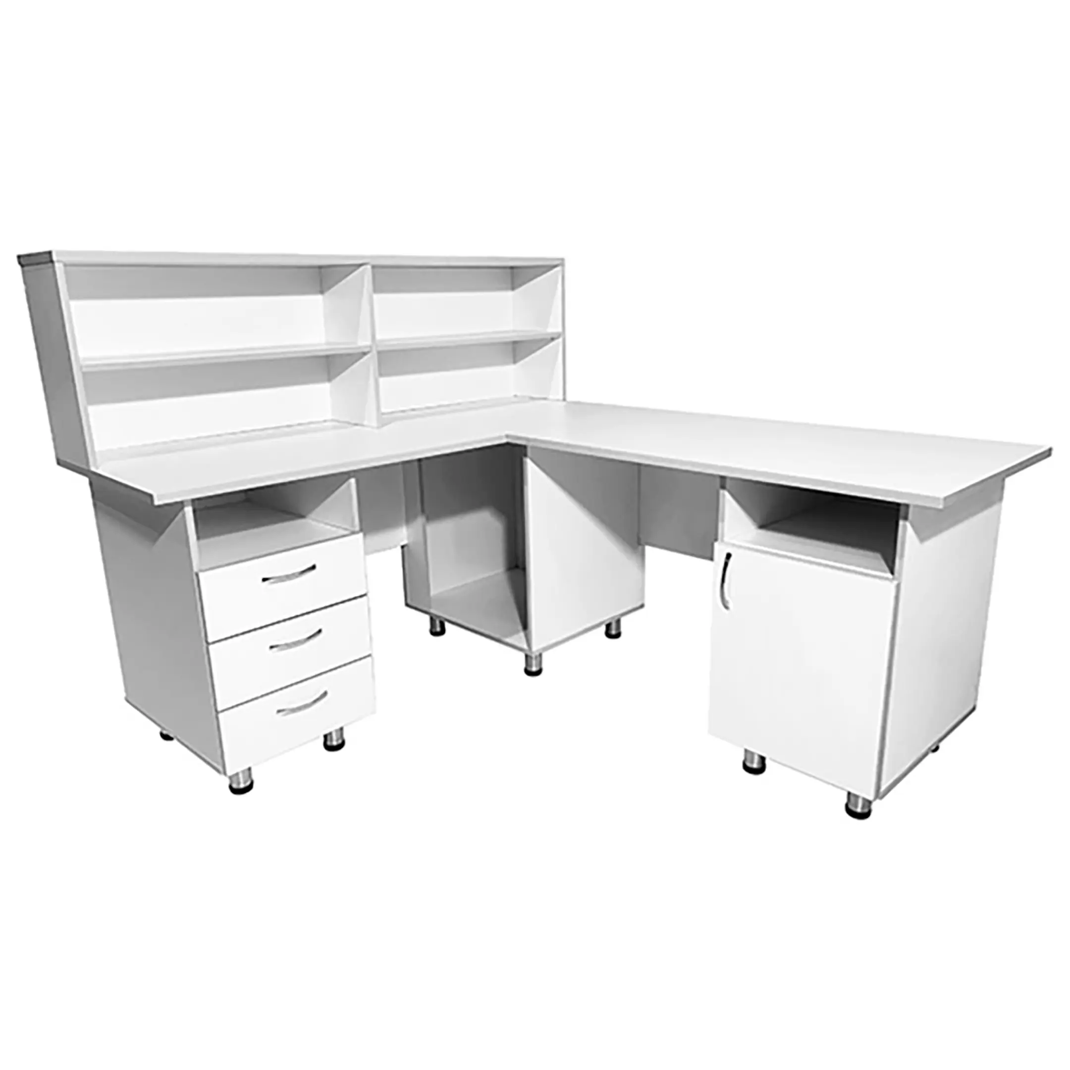 Стол-пост медицинский MD СтП 11.05 (белый) — это надежное и функциональное решение для обустройства рабочего места администратора в медицинских учреждениях. Модель выполнена из ЛДСП, имеет надстройку с полками под столешницей слева, тумбу с нишей и тремя выдвижными ящиками, а также тумбу с нишей и дверцей под столешницей справа.