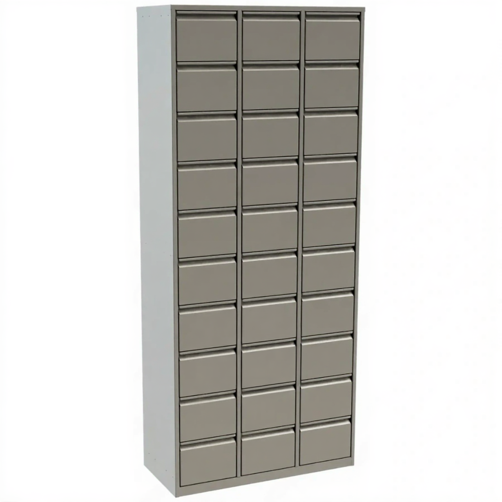 - Прочная и устойчивая конструкция большой емкости — шкаф изготовлен из высококачественной усиленной стали, рассчитанной на значительный вес полностью загруженных ящиков. Конструкция устойчива и долговечна, что критически важно для оборудования, находящегося в постоянном интенсивном использовании.