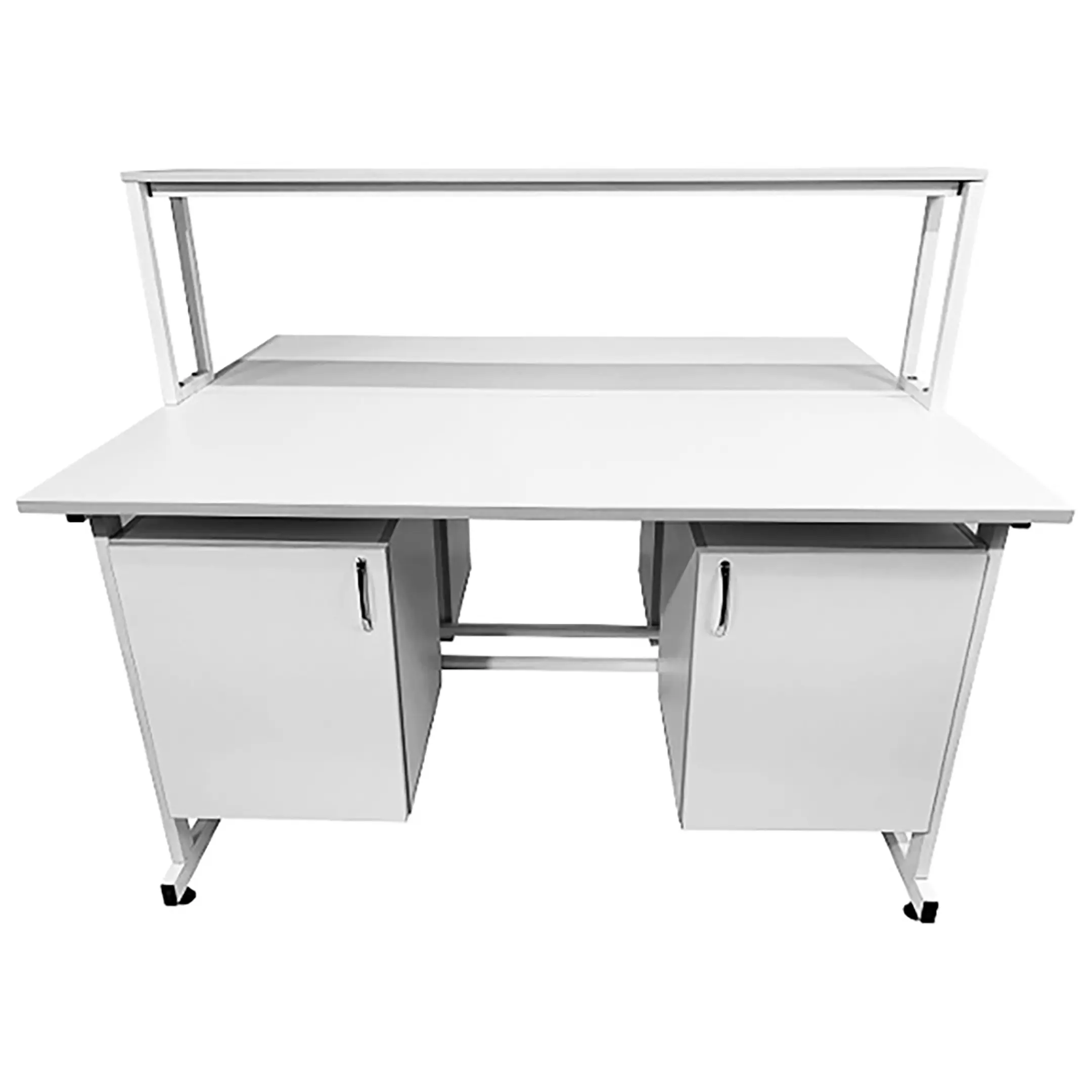 Стол лабораторный островной с надстройкой Сло 22.010 (белый) — это универсальное и функциональное решение для создания двух полноценных рабочих мест, специально разработанное для использования в лабораториях и медицинских учреждениях. Модель оснащена двумя рабочими местами, каждое с двумя подвесными тумбами с распашными дверками и полками, а также центральной надстройкой с одной полкой. Каркас выполнен из стального профиля, столешницы из ЛДСП толщиной 22 мм.
