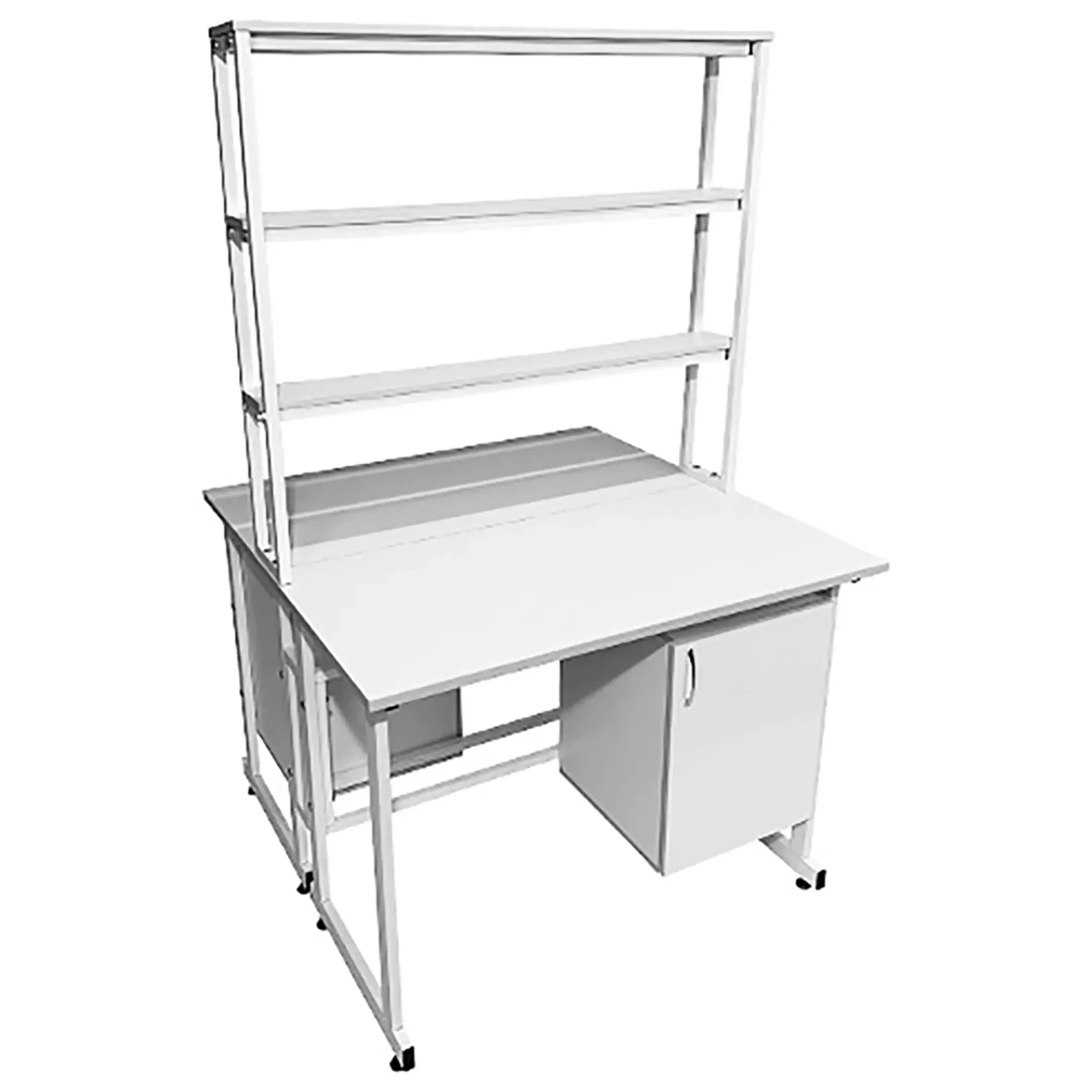 Стол лабораторный островной с надстройкой Сло 22.020 (белый) разработан специально для организации двух полноценных рабочих мест, предназначенных для сотрудников лабораторий и медицинских учреждений. Модель оснащена двумя рабочими местами, каждое с подвесной тумбой с распашной дверкой и полкой, и центральной надстройкой с тремя полками. Каркас выполнен из стального профиля, столешницы из ЛДСП толщиной 22 мм.