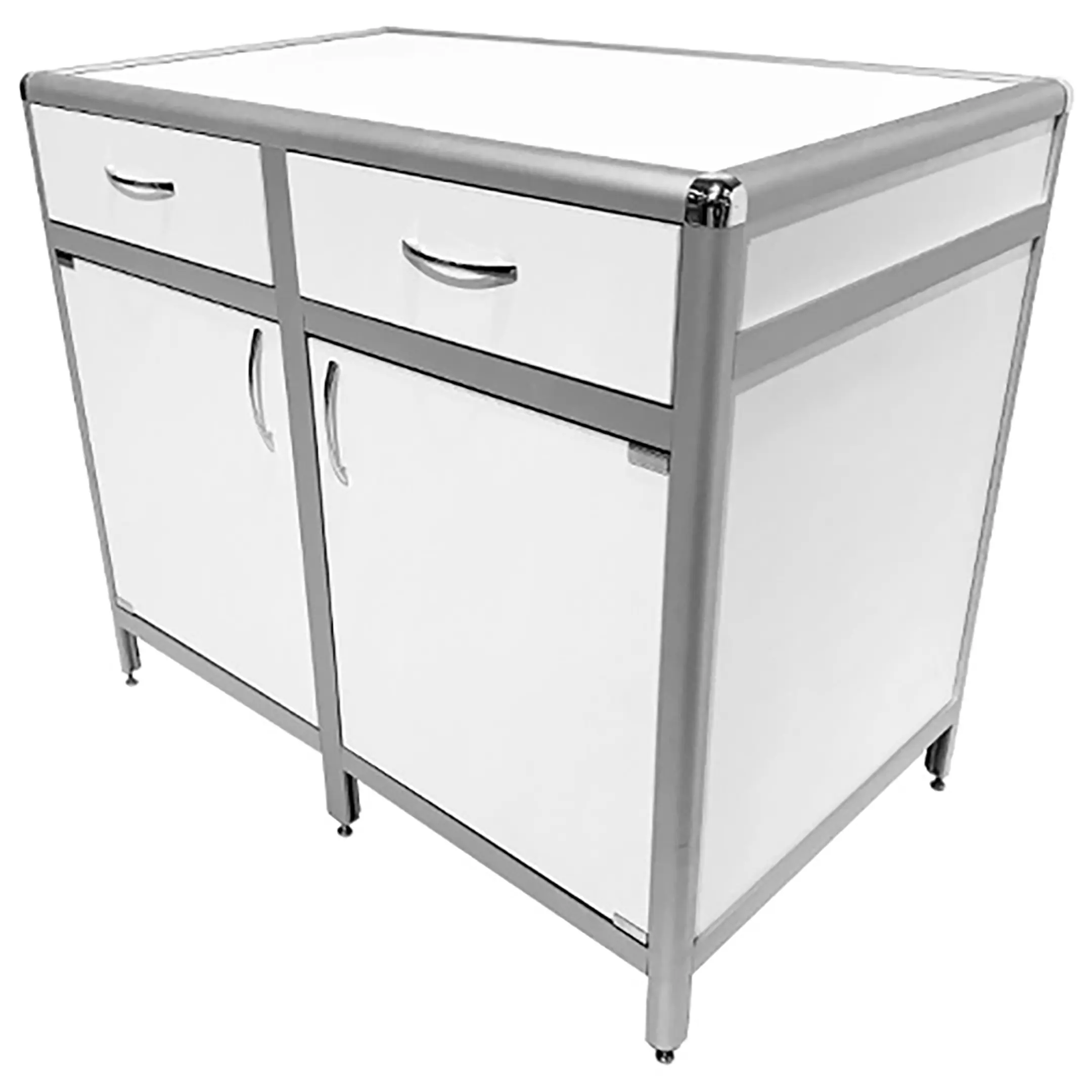 Стол-тумба лабораторная MED 12.006al (белый) — это функциональное решение для хранения лабораторного инвентаря, приборов и материалов в лабораториях и медицинских учреждениях. Модель оснащена двумя выдвижными ящиками (434х70х406 мм) и двумя тумбами с распашными дверками и полками внутри (полки 463х545 мм). Каркас выполнен из алюминиевого профиля, столешница из ЛДСП толщиной 16 мм.