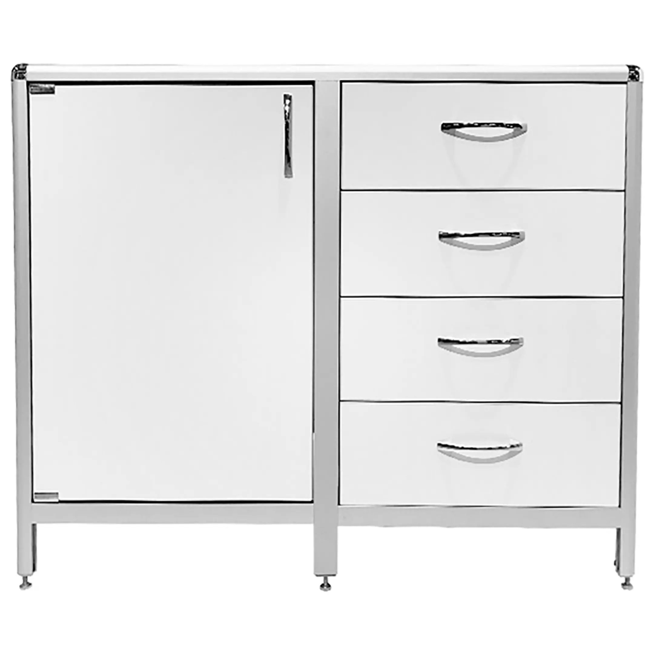 Стол-тумба лабораторная MED 12.012al (белый) — это функциональное решение для хранения лабораторного инвентаря, приборов и материалов в лабораториях и медицинских учреждениях. Модель оснащена тумбой с дверкой и полкой внутри (полка 463х545 мм), а также отделением с четырьмя выдвижными ящиками. Каркас выполнен из алюминиевого профиля, столешница из ЛДСП толщиной 16 мм.