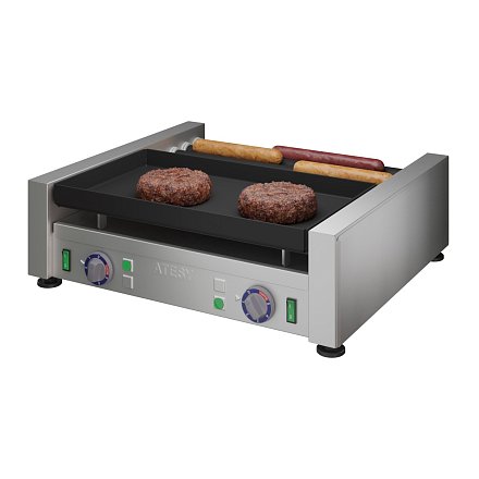 - Две рабочие зоны — зона для сосисок (5 роликов) и зона для котлет (жарочная поверхность).