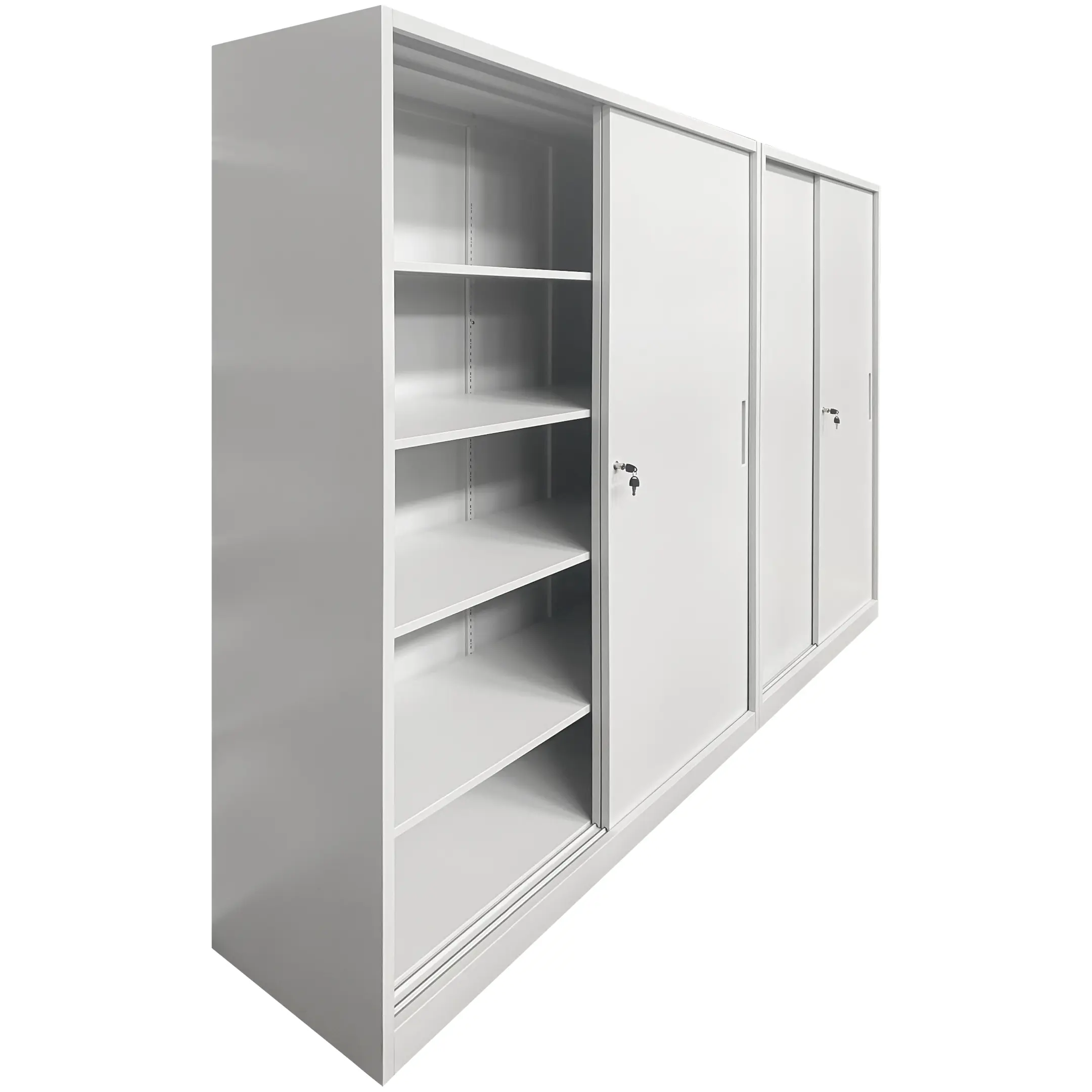 - Удобный и полный доступ — раздвижные двери обеспечивают широкий фронт работы, открывая доступ сразу ко всем полкам выбранной секции. Это делает процесс размещения и извлечения документов быстрым и комфортным.