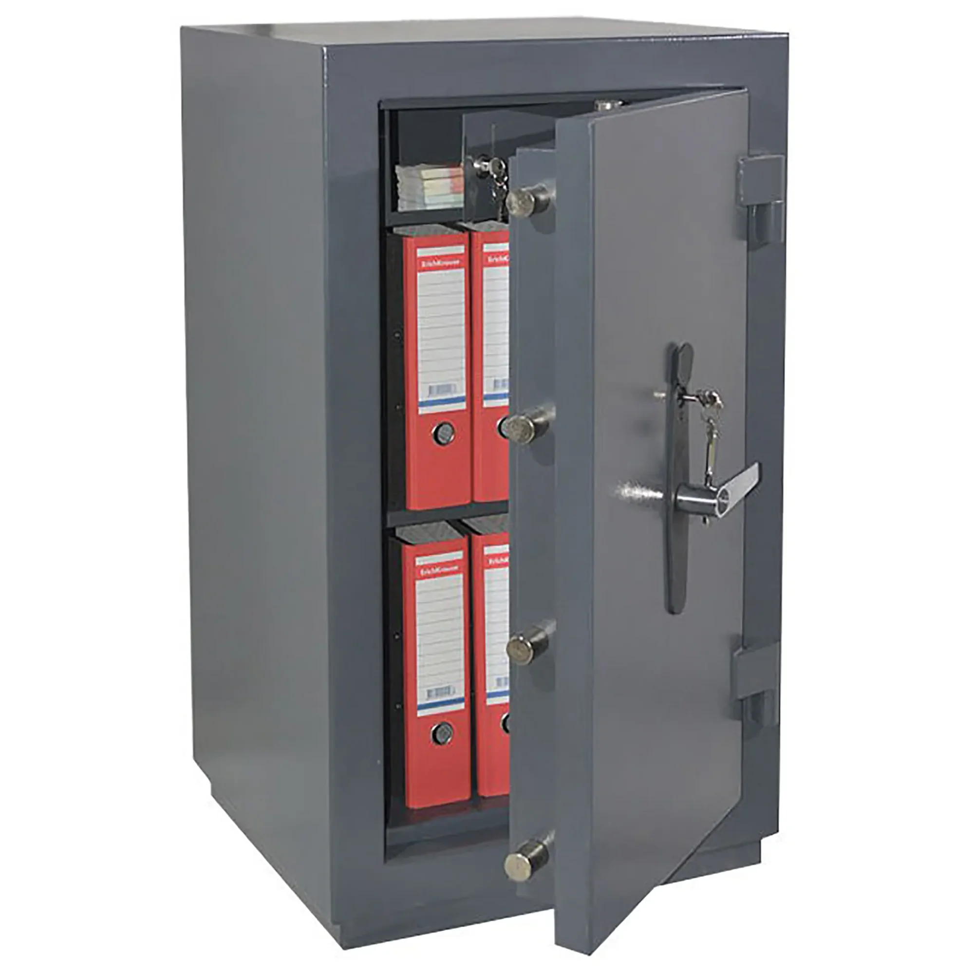- сейф оборудован высококачественным запорным механизмом, который блокируется замком сувальдного типа (производство Германия), что обеспечивает необходимую для третьего класса надежность от взлома;