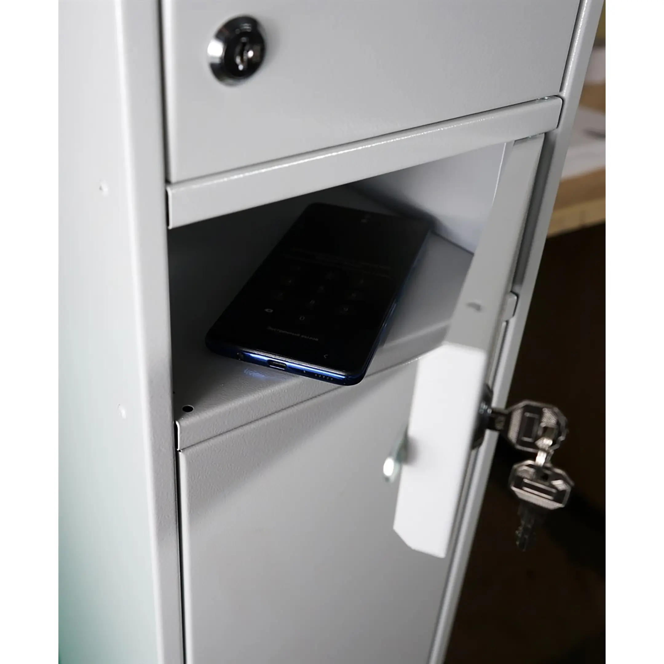- Надежная защита и прочная конструкция — оборудование изготовлено из качественных материалов, рассчитанных на ежедневное использование. Каждая ячейка оснащена надежным замком, что гарантирует сохранность устройств от кражи и несанкционированного доступа, соответствуя базовым требованиям безопасности в учреждениях.
