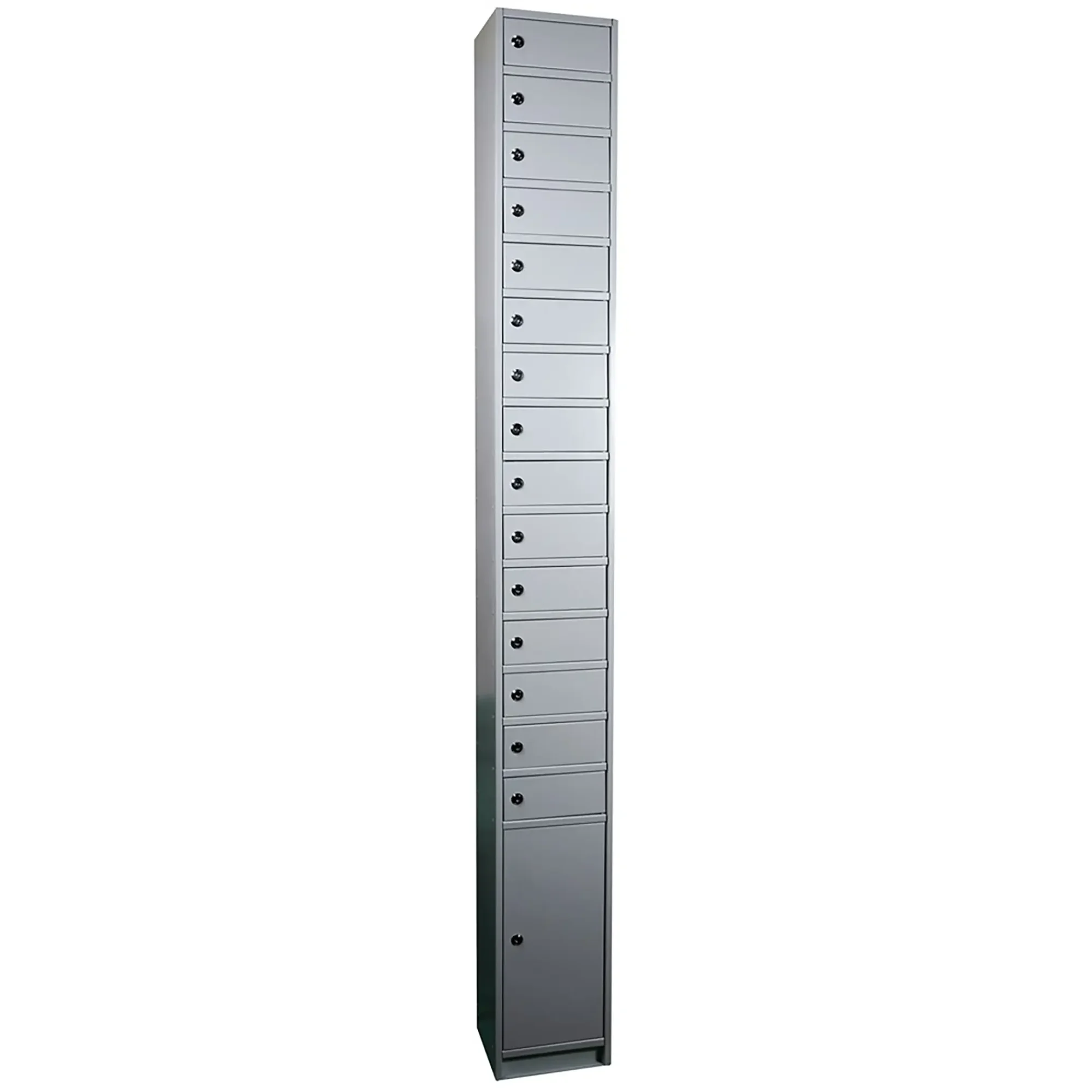 - Оптимальная вместимость для малых групп — шкаф предоставляет 16 индивидуальных запирающихся ячеек, что соответствует численности небольшого класса, рабочей группы или спортивной команды. Его вместимость достаточна для обеспечения порядка, но при этом модель остается компактной и не занимает много полезного пространства в помещении.
