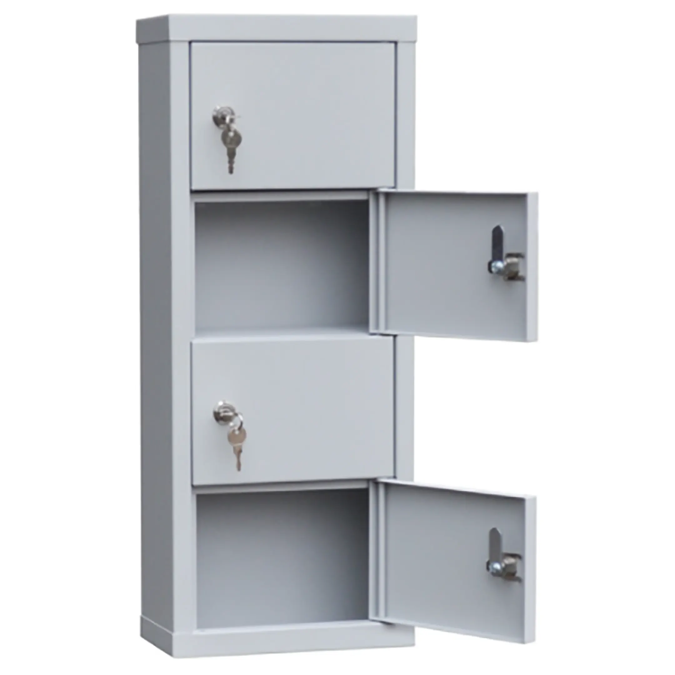 - Минимальные габариты для максимальной экономии пространства — шкаф занимает крайне мало места, предоставляя при этом 4 индивидуальные запирающиеся ячейки. Его можно разместить на любом свободном углу стола, полке, прилавке или в сейфе, не нарушая эргономику рабочего места.